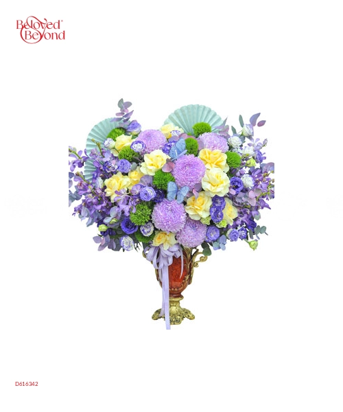 Sắc Tím Yêu Thương là sự kết hợp tinh tế giữa sắc tím thanh nhã của cúc mẫu đơn, hoa lan, cát tường, hoa hồng vàng victo và điểm xuyết bằng sắc xanh tươi mát từ hoa green wicky. Tổng thể bình hoa mang đến cảm giác sang trọng, ấm áp và tràn đầy năng lượng tích cực.