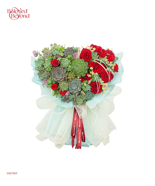 Kệ hoa này nổi bật với những bông hoa sen đá xanh mát, biểu tượng của sự bền bỉ, được kết hợp với những bông hoa hồng đỏ đằm thắm là biểu tượng của sự nhiệt huyết và đam mê. Tổng thể màu sắc đối lập và bố cục cân đối của mẫu hoa này tượng trưng cho một lời chúc của sự vững bền và thịnh vượng, cùng với tình yêu mãnh liệt và sức sống tràn trề. Đây là một món quà lý tưởng để chúc mừng những thành tựu lớn, hoặc biểu đạt lòng biết ơn và sự quan tâm sâu sắc.