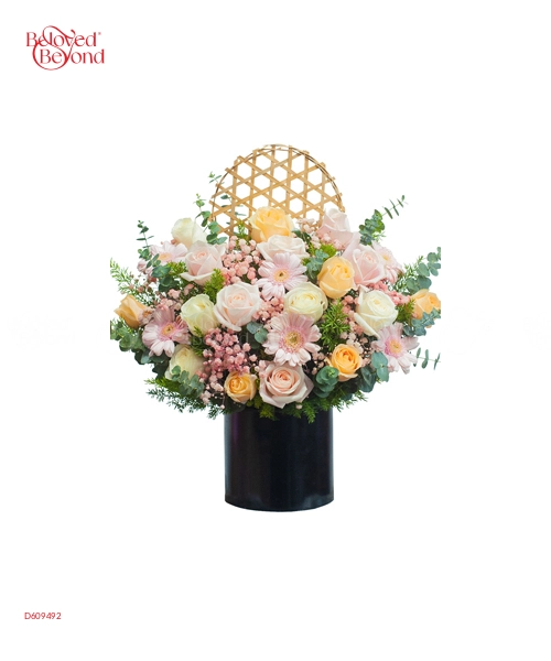 Sự hài hòa màu sắc chính là điểm cộng lớn nhất trong mẫu thiết kế này. Sắc hồng pastel chủ đạo được kết hợp với sắc cam dịu nhẹ và được điểm xuyết một vài sắc xanh tạo nên một tổng thể vô cùng dịu mắt. Hộp hoa thích hợp tặng những bạn có tính cách nhẹ nhàng, yêu thích sự bay bổng và lãng mạn.