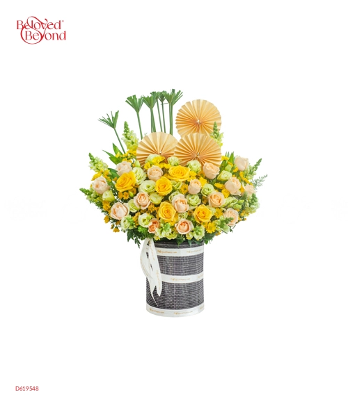 Lẵng hoa tone vàng là một tuyệt tác của sắc hoa màu vàng, tạo nên sự ấm áp và tươi vui. Lẵng hoa này thường được làm từ những loại hoa có màu vàng như hoa hướng dương, hoa cúc, hoa ly, hoa cẩm tú cầu, hoa cúc mẫu đơn, và nhiều loại hoa khác. Màu vàng thể hiện sự tươi sáng, hạnh phúc và may mắn.